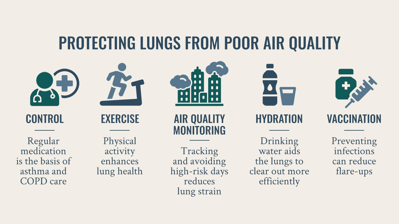 On high-risk days with poor air quality, Dr. Beeh advises moving exercise indoors or exercising early in the morning, before the heat and pollutants rise. Blowing dust can also strain the lungs on hot days, increasing the risk of respiratory infections like pneumonia. Staying hydrated helps counteract the dryness, but the danger is especially high for the elderly during prolonged heat waves.