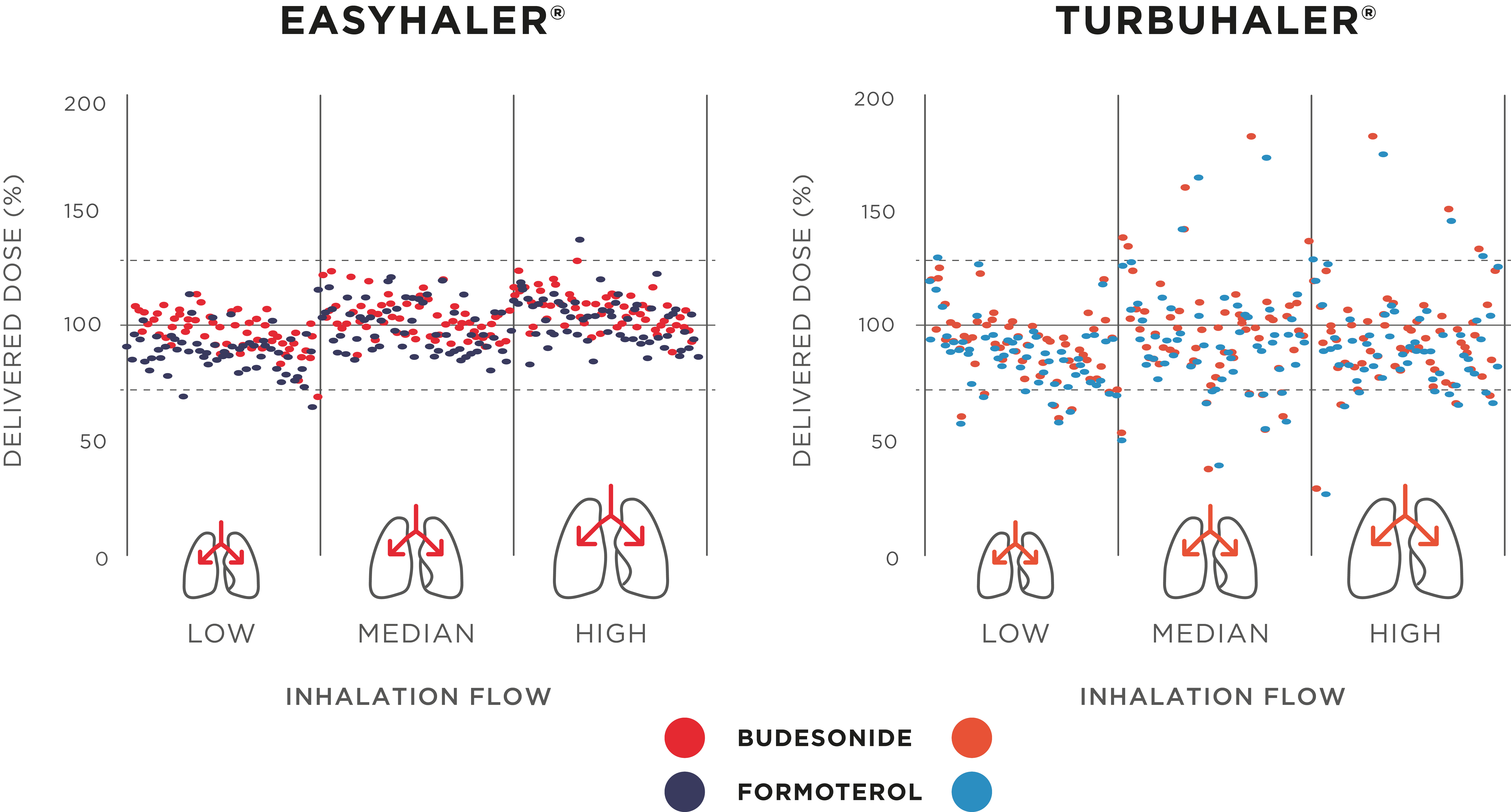 BUFOMIX Easyhaler® obsahující budesonid a formoterol vykazuje přesnější a konzistentnější podávání dávky v rozsahu inspiračních průtoků pacienta než referenční práškový inhalátor (P <0,001, obrázek 1). Dodávka dávky zůstává konstantní po celou dobu životnosti produktu. Nejsou ovlivněny zátěží prostředí včetně vlhkosti, pádu, vibrací a opakovaných cyklů zmrazování / rozmrazování2. BUFOMIX Easyhaler® poskytuje přesné a konzistentní dávkování od špičkového inspiračního průtoku 30 l / min2,3.