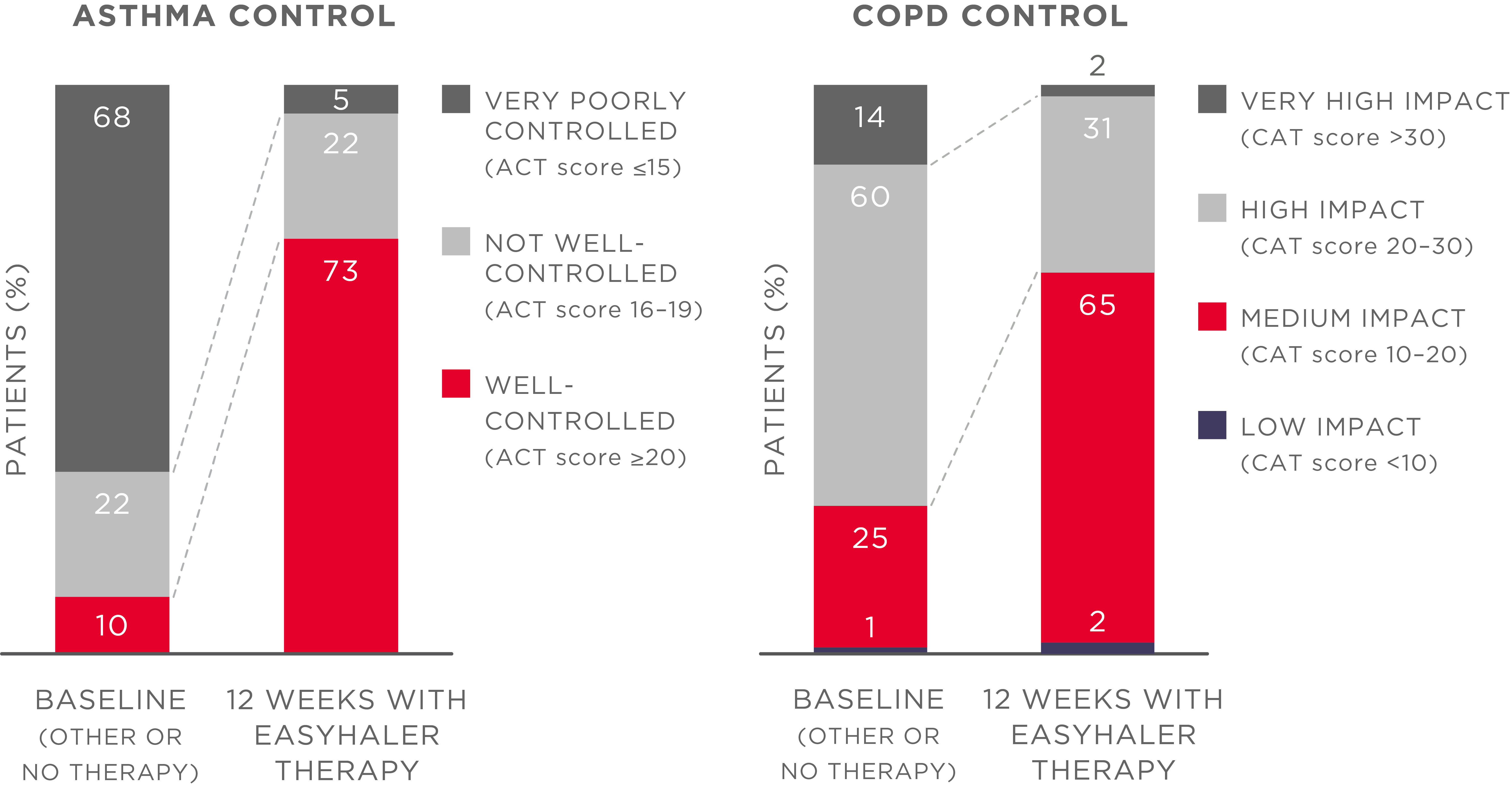 Jak u nově diagnostikovaných pacientů (kteří dříve inhalátory nepoužívali), tak u pacientů přecházejících z jiných inhalátorů zlepšilo použití přípravku BUFOMIX Easyhaler® obsahujícího budesonid a formoterol kontrolu astmatu a CHOPN (Asthma Control Test, ACT; COPD Assessment Test, CAT ) (Obrázek 2) 4.5. Kromě kontroly onemocnění zlepšuje léčba přípravkem BUFOMIX Easyhaler® významně kvalitu života, pokud jde o astma a CHOPN (mini-AQLQ, mMRC stupnice dušnosti, P <0,001) 4.